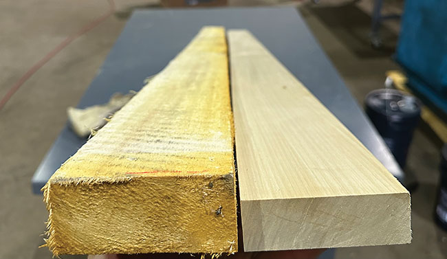 A comparison of aspen lumber before (input) and after (densified). Photo courtesy Deadwood Innovations